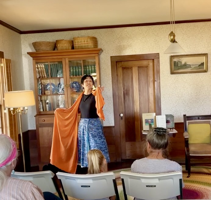 On October 12th “Our Guiding Lights,” our second program with live music and slides, focused on Camilla Coumbe Kirkpatrick, Lottie Coumbe Robertson, and Mary Kirkpatrick Moffat: the three women who inspire Ben and Bruce Moffat to share Tippesaukee Farm with the community. Performed by Ben, with help from Bruce on tech and guitar, the show demonstrated that preserving and protecting this remarkable place is actually a multi-generational effort whose roots go back to the 19th century. As Ben said during the performance, “People have been gathering at this beautiful spot for thousands of years; we should take time to savor it, too.” There were teary eyes in the audience as he shared family stories about these three “fore-mothers,” Camilla, Lottie, and Mary.